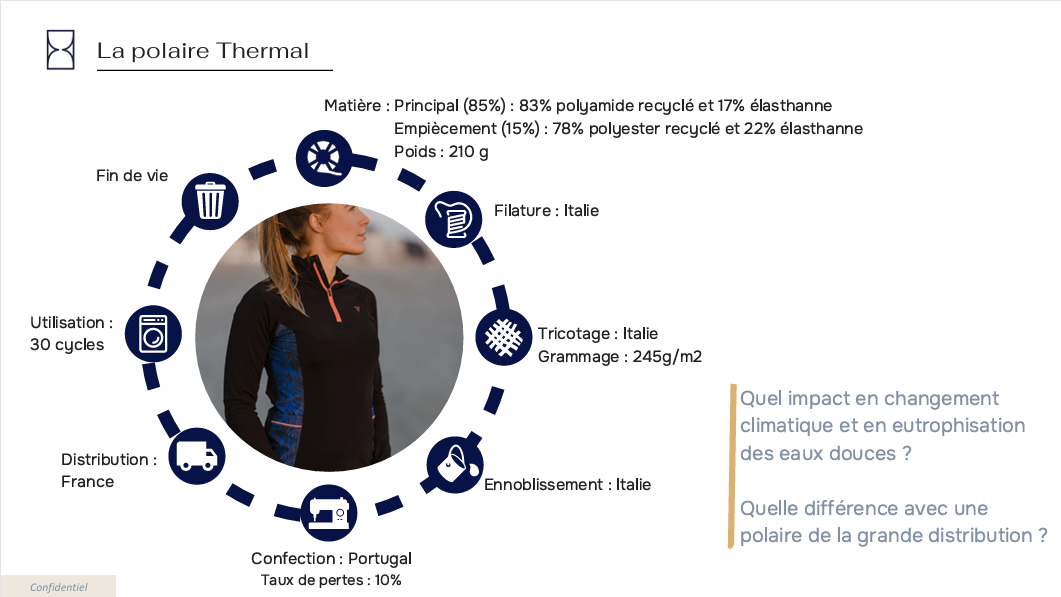 Bien que notre démarche soit solide, elle n’est pas parfaite. Il est parfois difficile de mesurer précisément notre impact et de savoir comment l’améliorer. C’est pourquoi nous avons choisi d’approfondir notre compréhension en utilisant une méthode appelée Analyse de Cycle de Vie (ACV). Cela nous permet de mesurer l’impact environnemental réel de nos vêtements et d’agir sur les points cruciaux. L’ACV nous aide à concevoir des produits à la fois techniques, confortables, stylés… et responsables.
